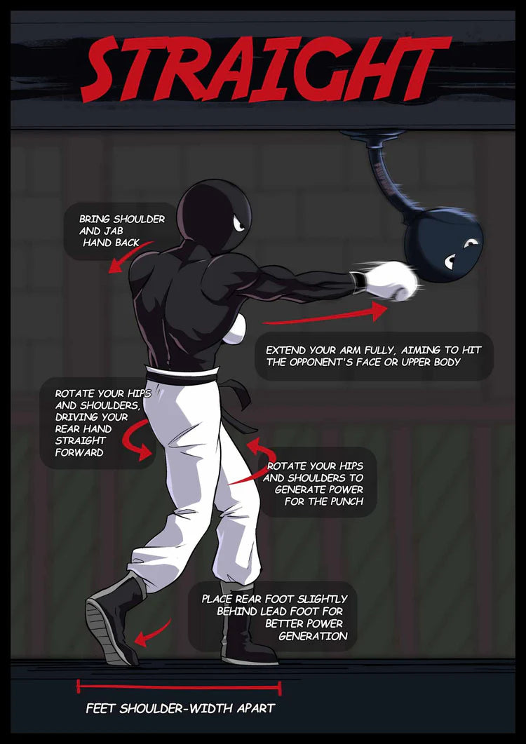 Your rear hand is your cannon. Launch it with your whole body. Twist from the hips, drive from the toes, and make sure your punch isn’t justfelt— it’s remembered.